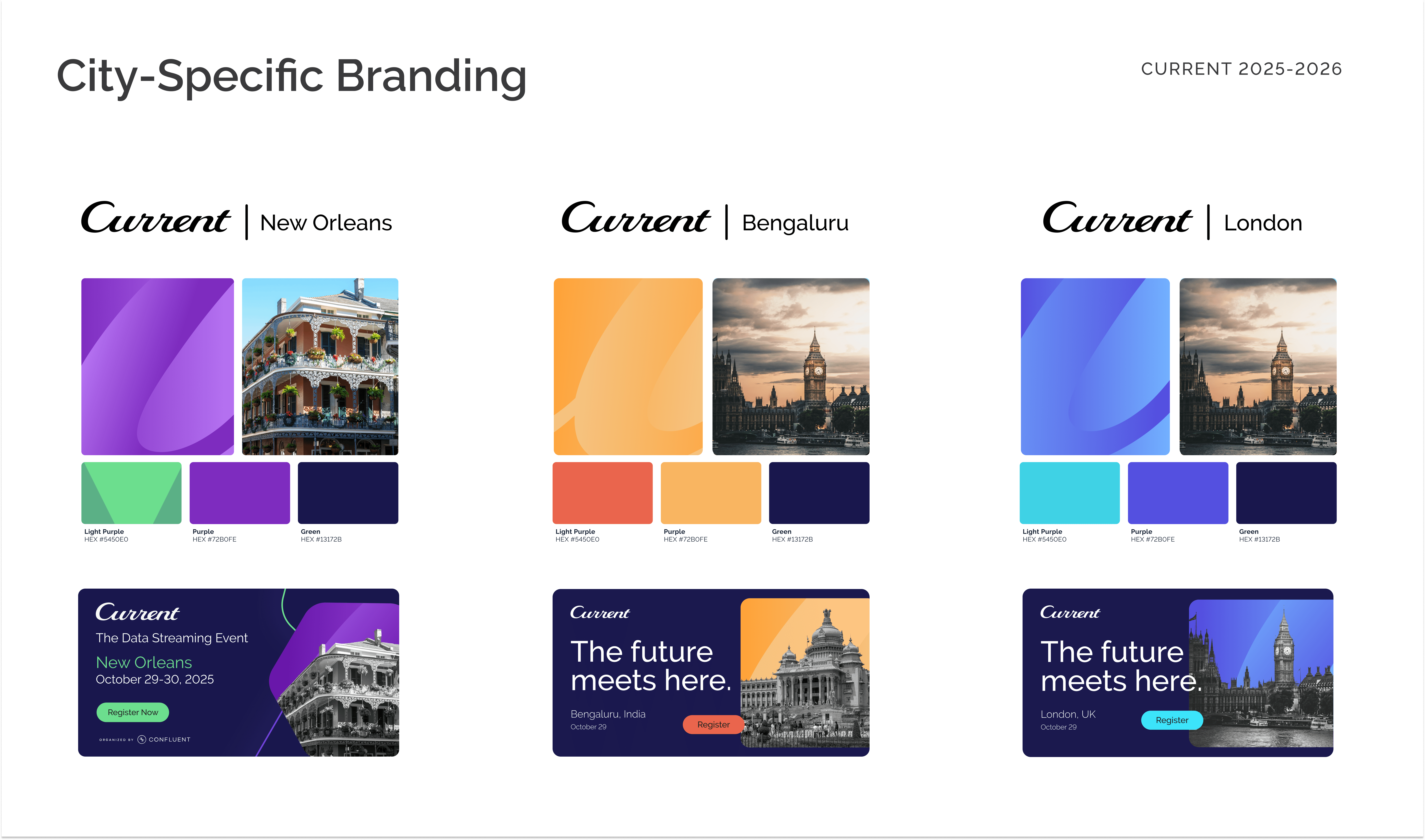Current is Confluent’s flagship event, bringing together leaders across data streaming and AI technologies. As the event expanded globally, the absence of a unified system led to fragmentation across regions and formats. The challenge was to create a cohesive identity that could scale across environments while supporting a growing ecosystem of sub-events and programming.